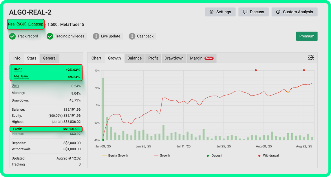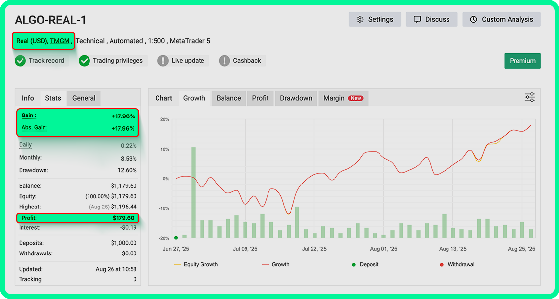 Explore our Myfxbook portfolio to see the outstanding performance of our Algo over the last three months. Witness firsthand how our automated trading strategies have consistently outperformed the market.