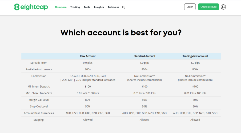 Eightcap is providing two accounts โ Standard and raw. Both accounts require a minimum deposit of A$100. Standard account comes with zero commissions, where the Raw account charge is A$3.50 per standard lot. Both accounts have different advantages. You can choose the best account for you according to your preference.