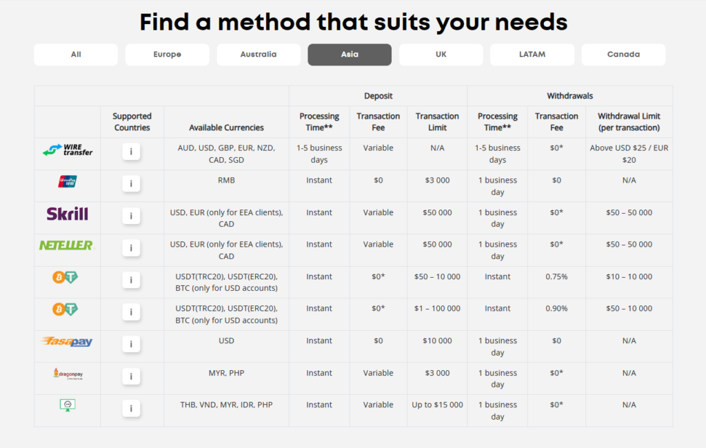Deposits: They have plenty payment methods available for depositing your funds in to your account. They do not charge any internal fees on deposits.