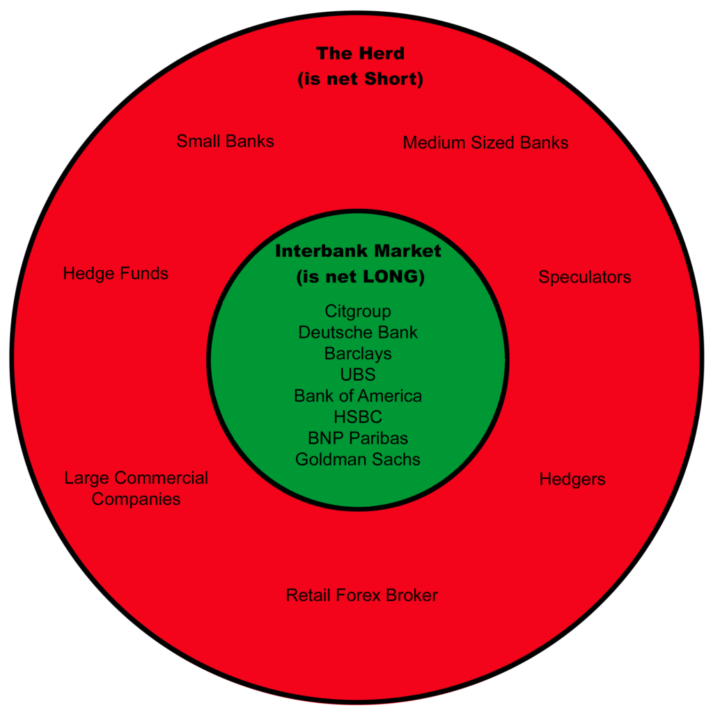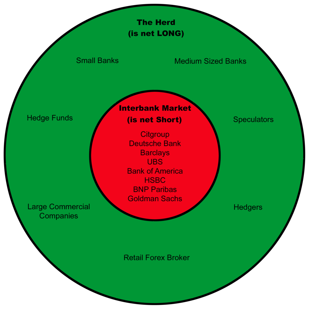 The interbank market is net short if the herd is net long, as shown by the colors in the accompanying diagram: